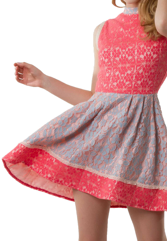 Sweet, spice and everything nice. This hot pink lace overlay dress is the epitome of charm, youth and quirk. Wear with a pair of white sneakers for street style flair or a pair of sandals for a dress up occasions in the outdoors. Babydoll silhouette emphasizes the waist, making this piece ideal for all body types.